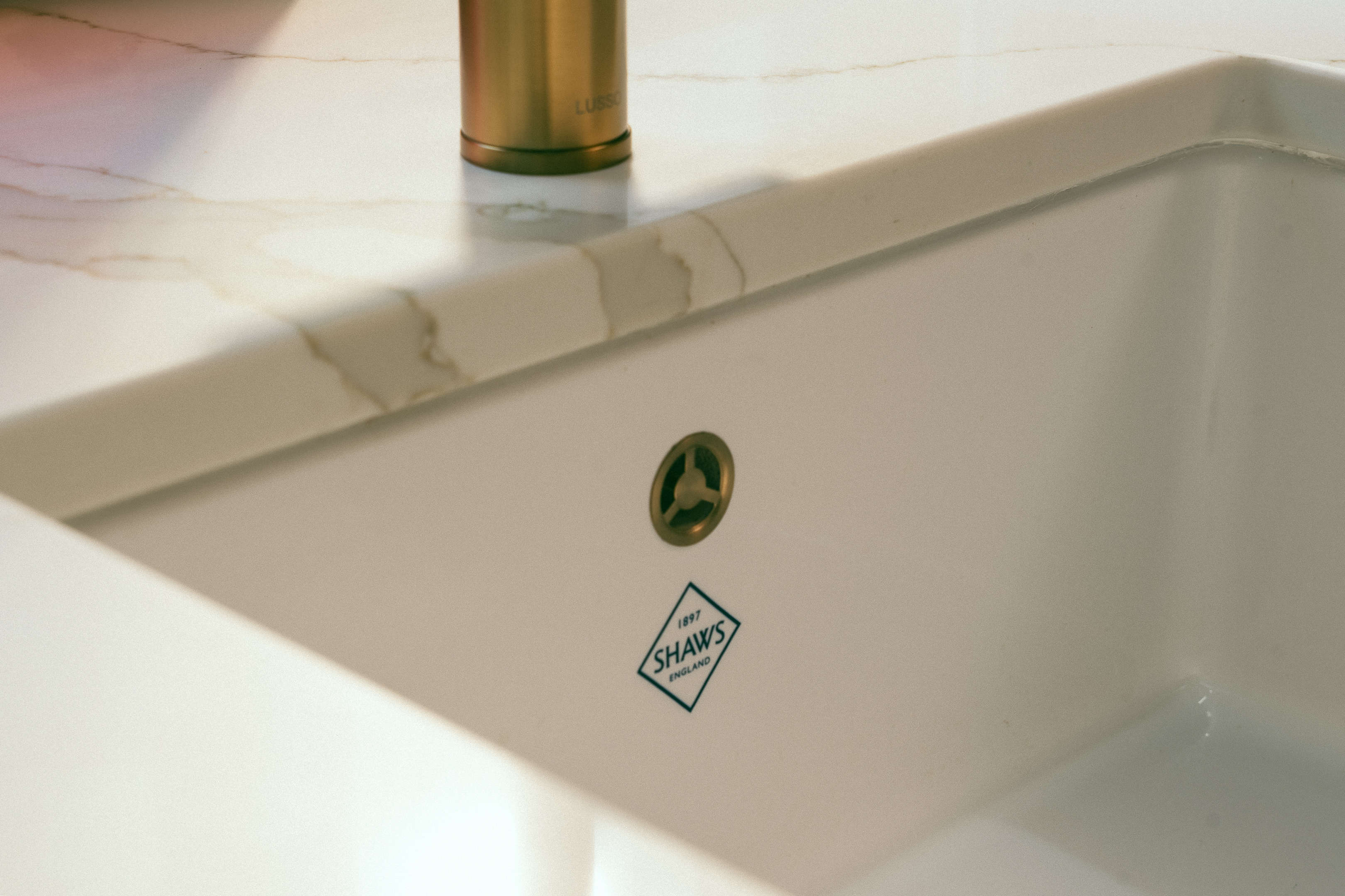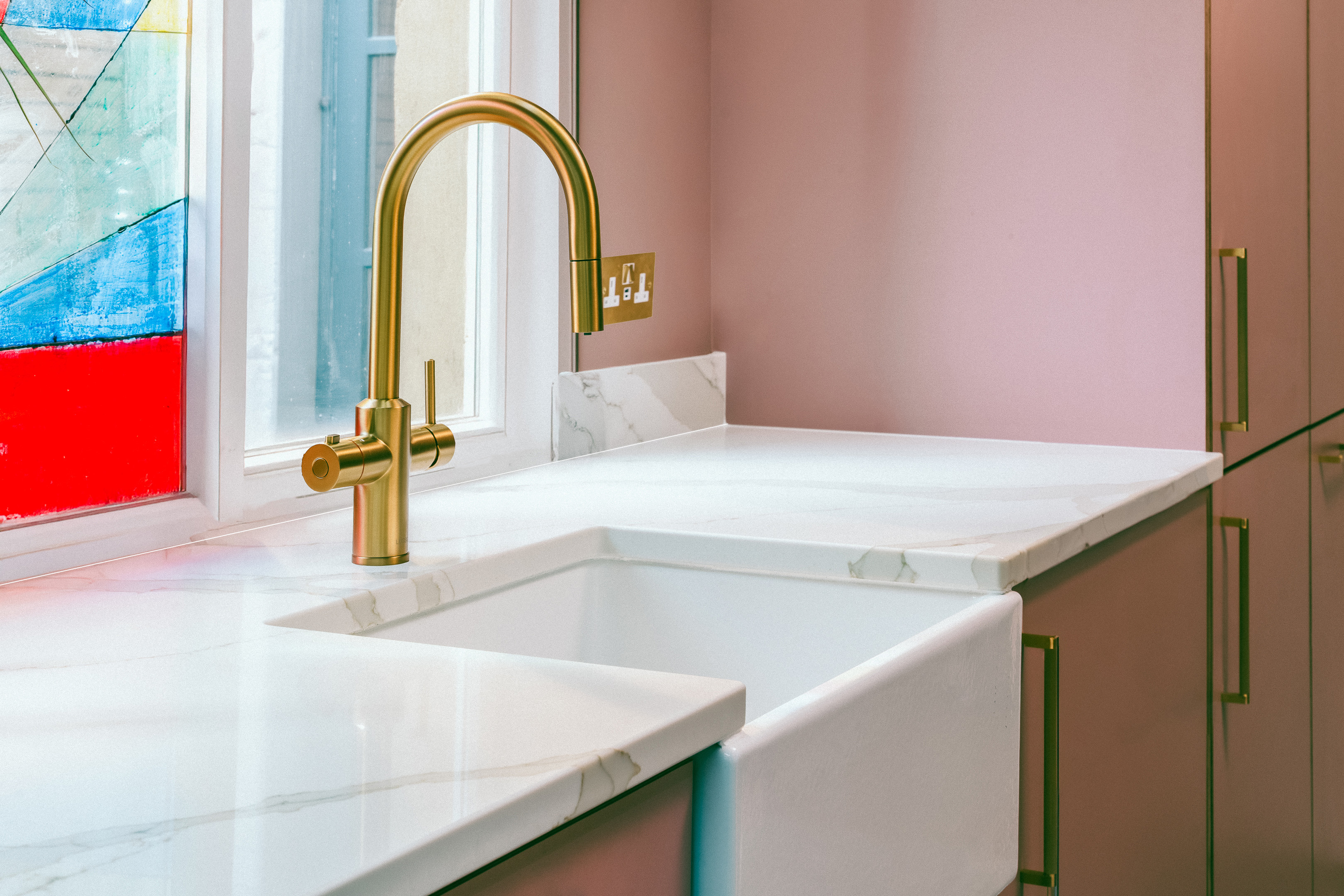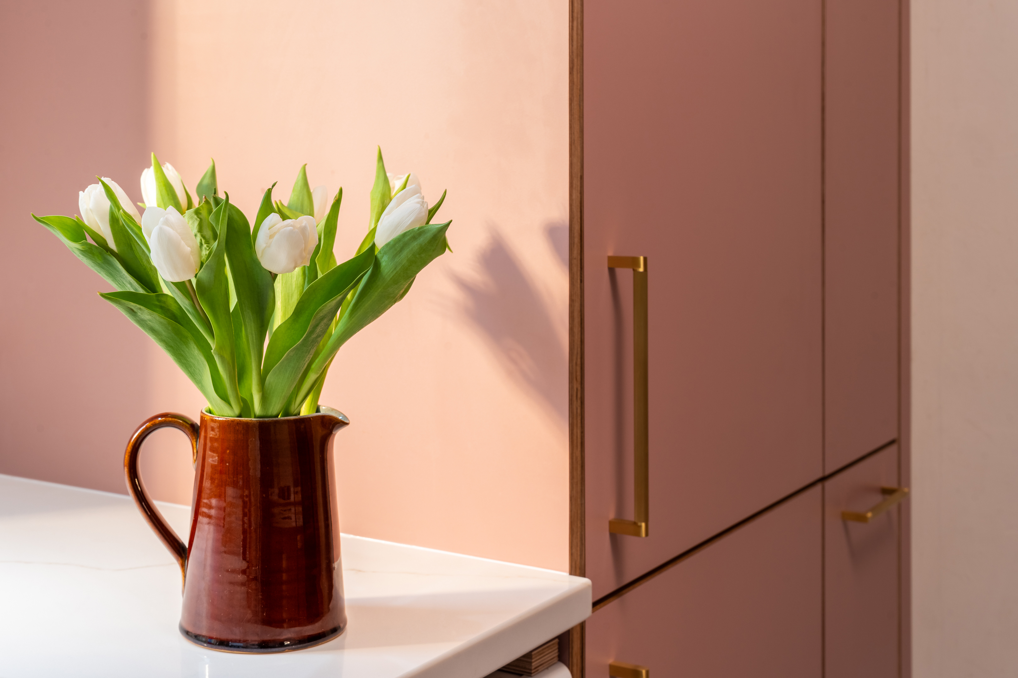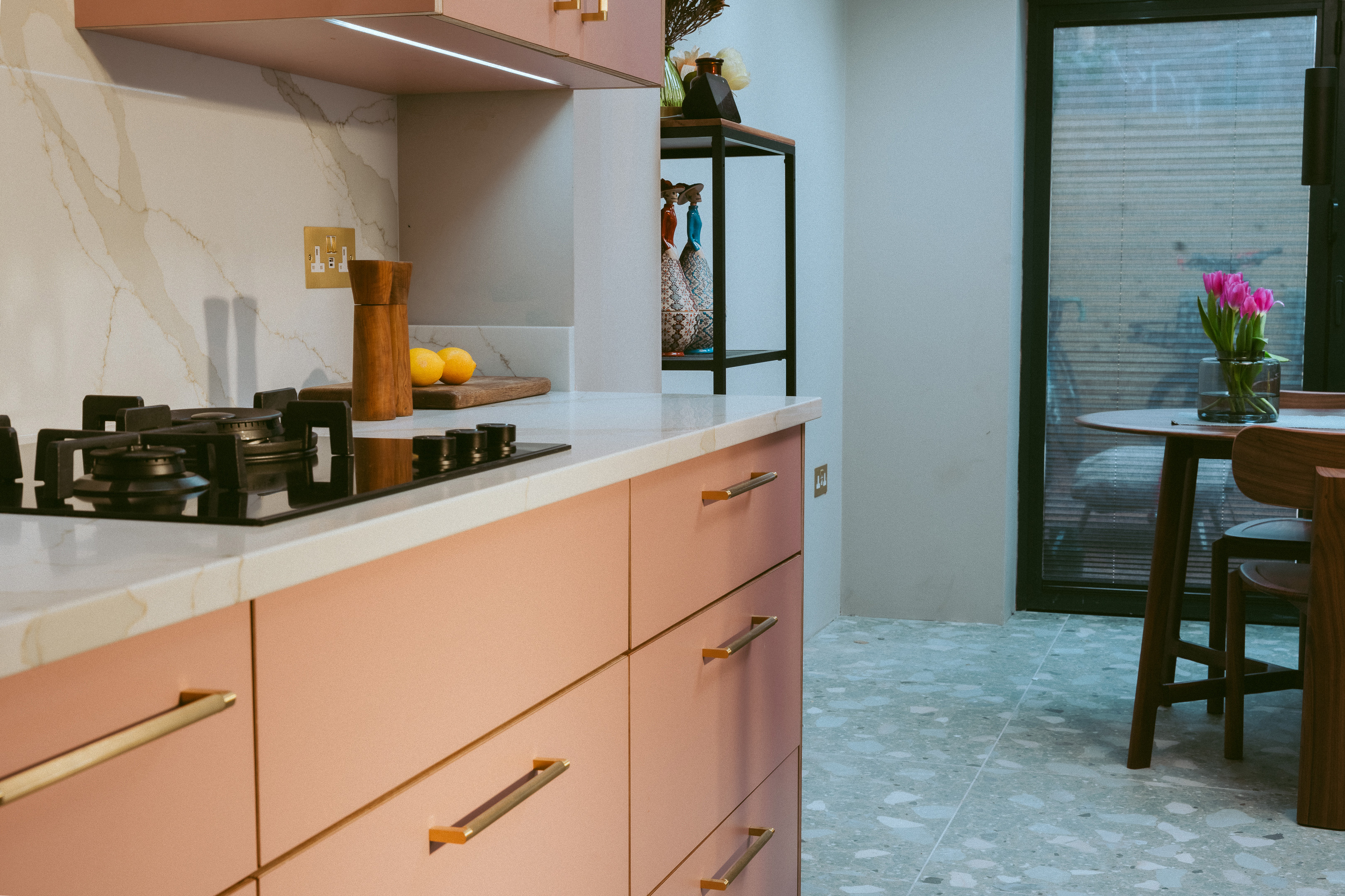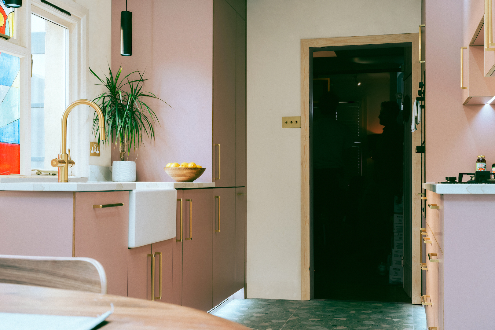 A Dusty Pink finish brings warmth and personality, balanced by striking black and brass fittings. Exposed Birch Plywood endgrain adds a raw, tactile detail that grounds the space with natural texture. With the client’s passion for cooking in mind, the layout was planned for total functionality. A seamless connection between sink, hob, and fridge creates a space where daily routines feel easy, efficient, and considered — in a kitchen designed to be lived in. Built by Stagg Build. Photography by Matt Wellham
