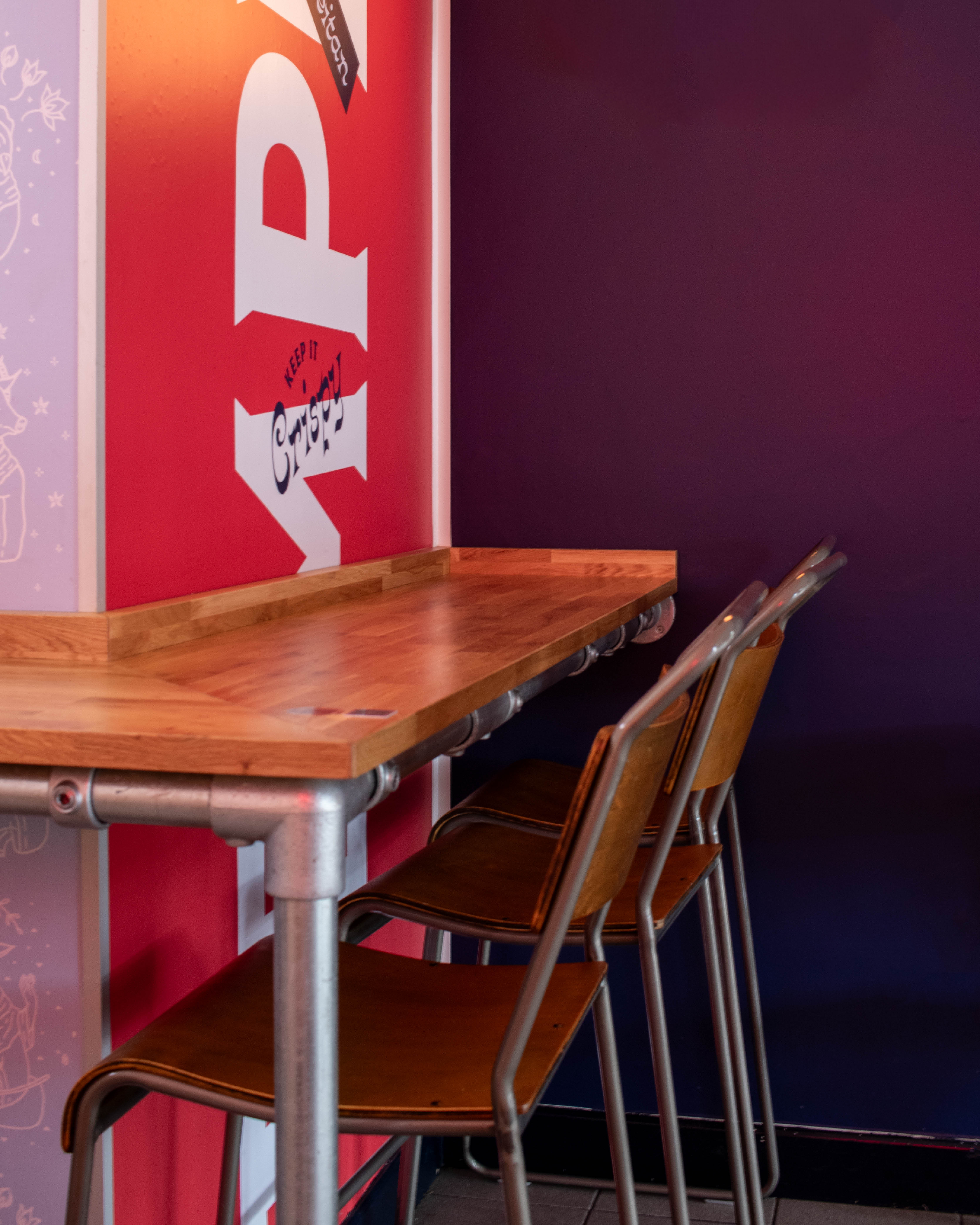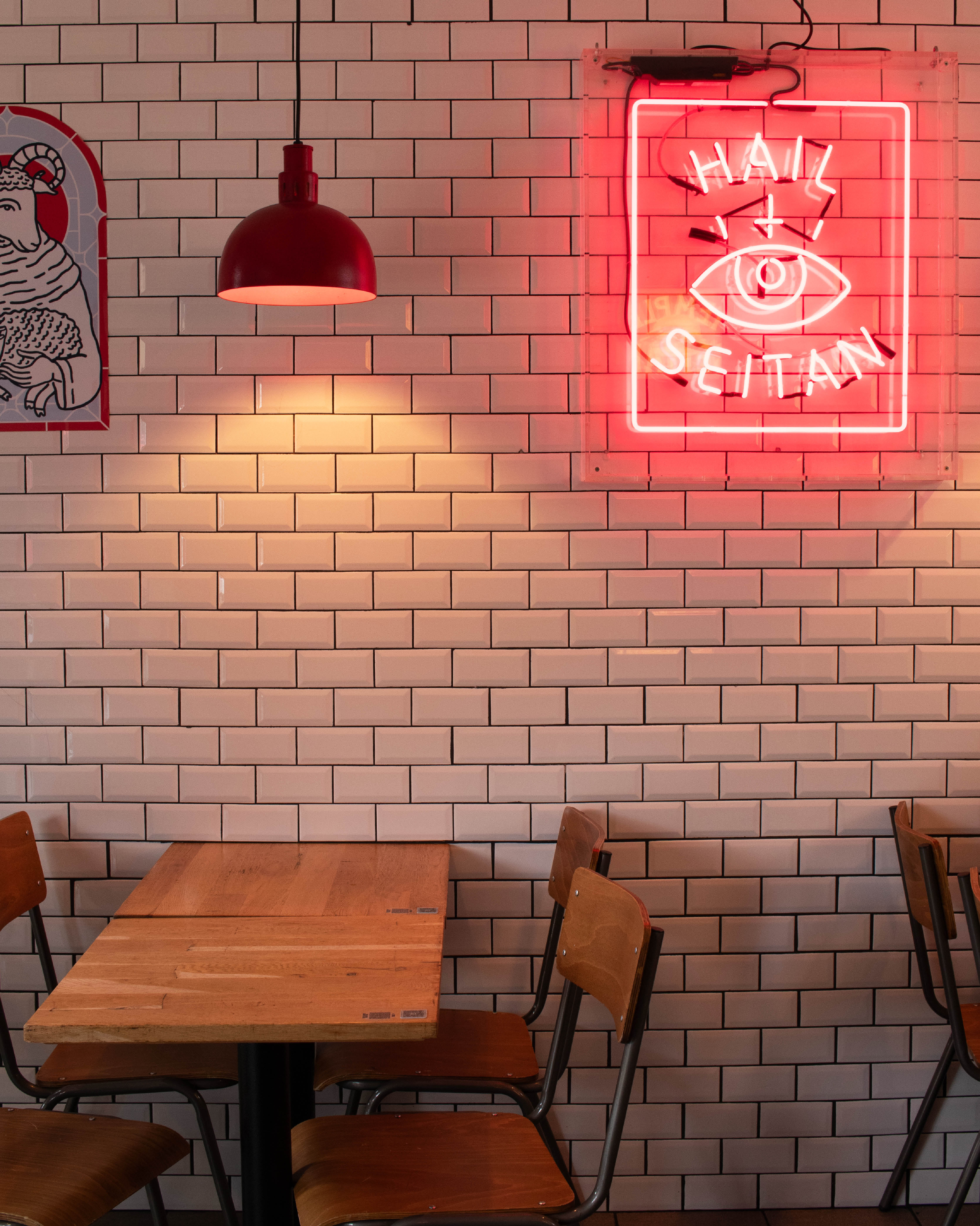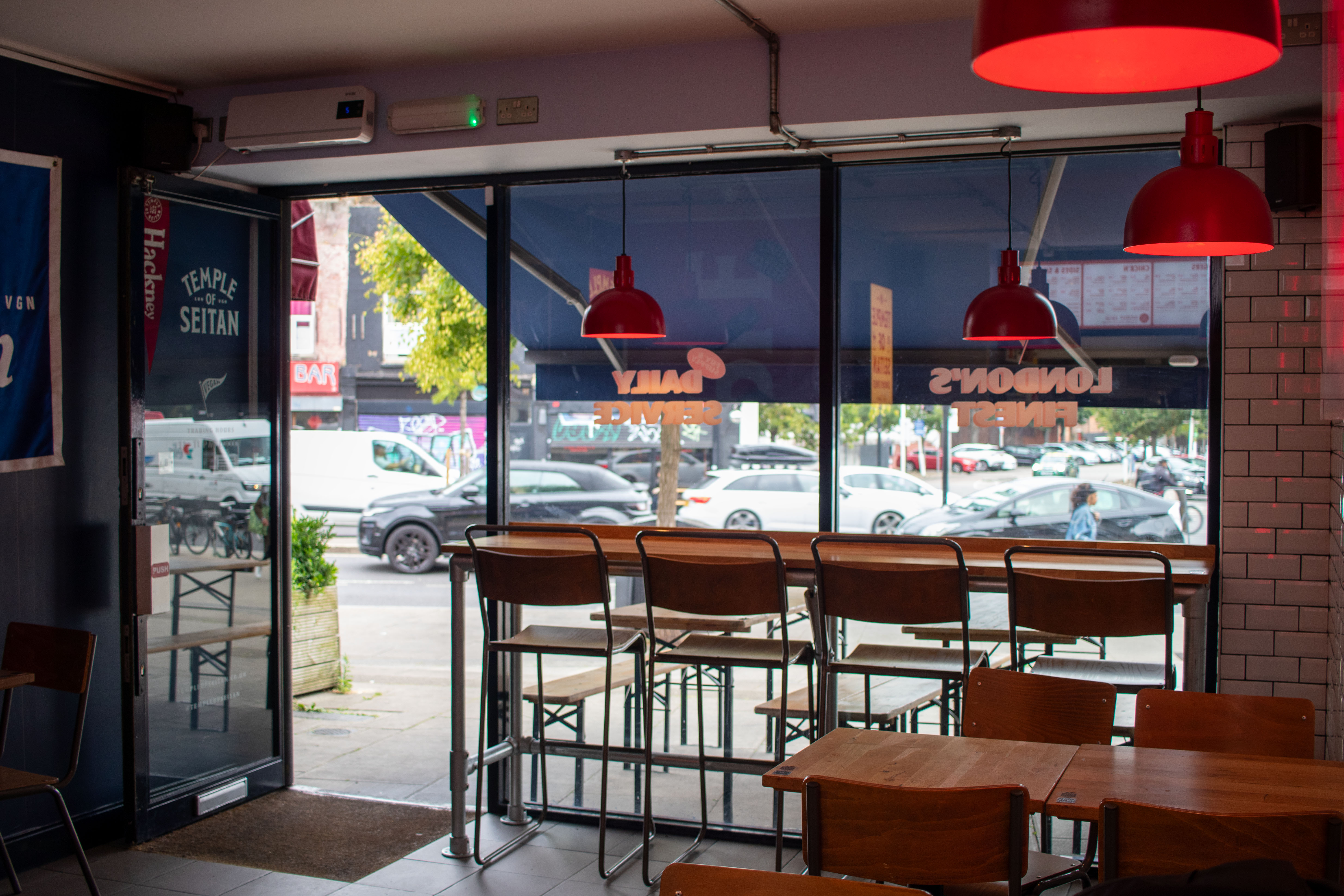 Temple of Seitan approached us looking to increase seating capacity and to draw more customers into their Hackney store. After reviewing the customer flow and experience, we developed a layout scheme for the store. To maximise covers and take advantage of the striking full-height window overlooking Hackney, we designed and built an industrial-inspired oak and scaffolding-height table — perfect for serious people-watching. At the rear of the shop, additional tables were wrapped around a protruding wall, guiding customers toward the till.